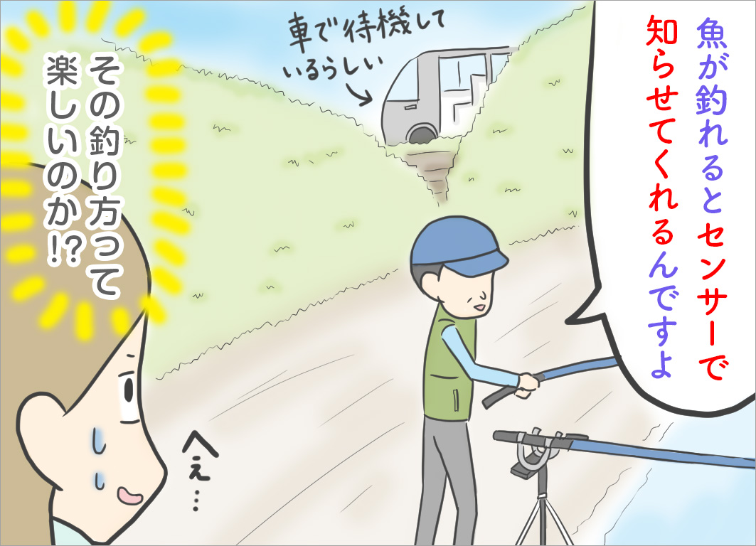 センサーがあり、魚が竿を引くと遠くにいても知らせてくれるようです。